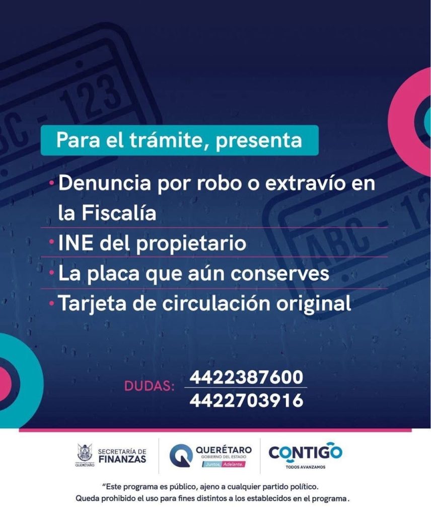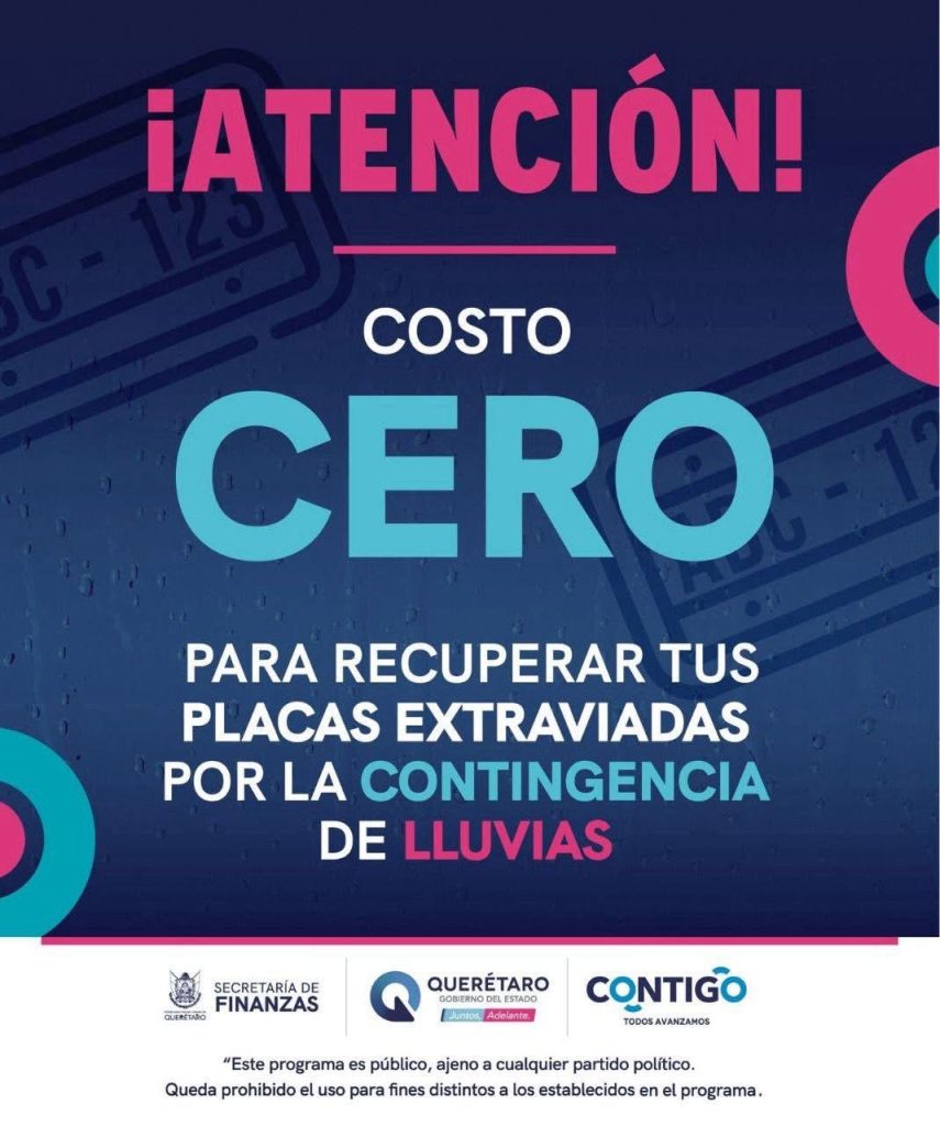 Debido a la contingencia ocasionada por las fuertes lluvias, el Gobierno del Estado de Querétaro informó que los automovilistas que hayan extraviado sus placas podrán recuperarlas a costo cero.