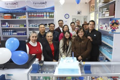 Autoridades de la Universidad Autónoma de Querétaro (UAQ) y de la Facultad de Química (FQ) celebraron el octavo aniversario de la Farmacia Universitaria «FarmaUAQ», proyecto que se ha consolidado como un referente de los servicios que brinda esta Alma Mater. A lo largo de estos años, ha fortalecido su compromiso con la comunidad UAQ y la sociedad queretana ofreciendo medicamentos de patente y genéricos, además de artículos