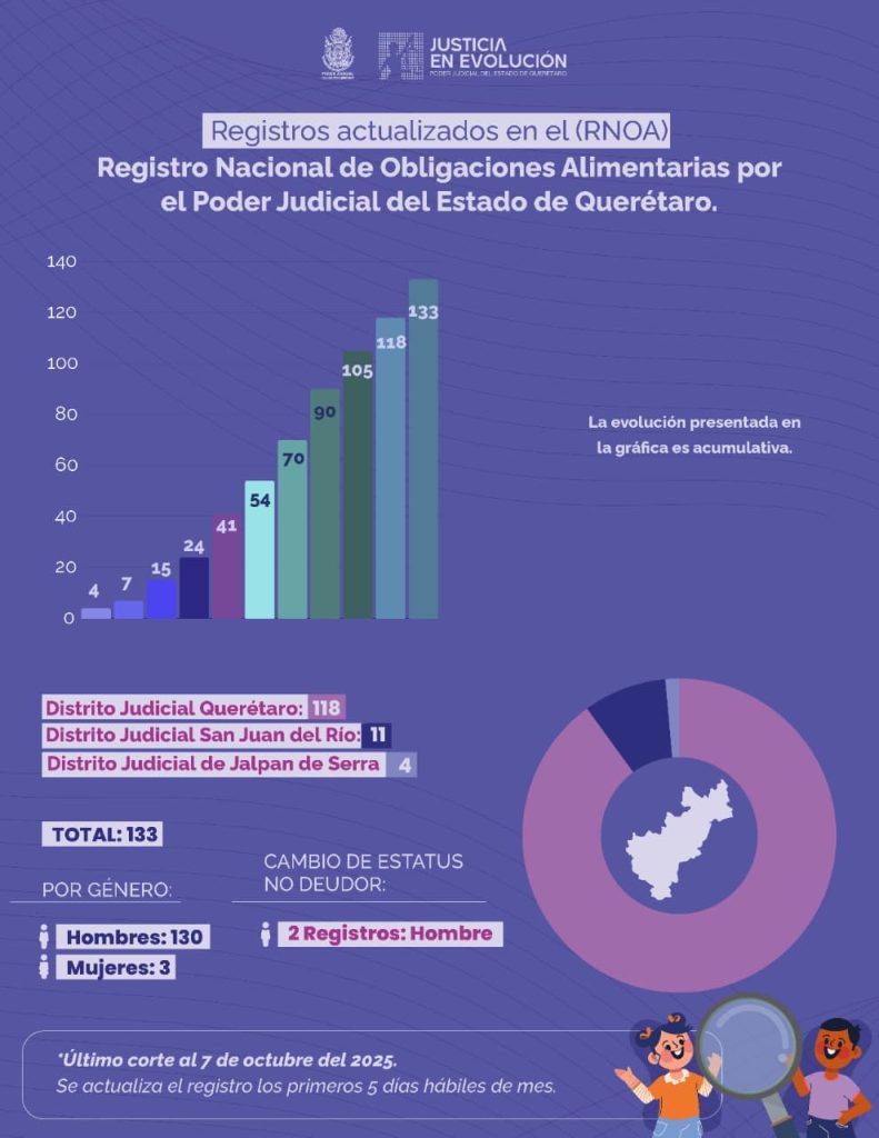 El Poder Judicial del Estado de Querétaro informó que, hasta el 7 de octubre, se contabilizan 133 altas de deudores morosos y dos cambios de estatus a no moroso dentro del Registro Nacional de Obligaciones Alimentarias (RNOA), plataforma implementada a nivel nacional por el Sistema DIF.
