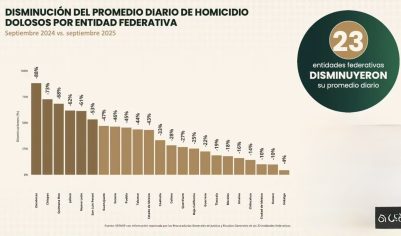 A nivel nacional, el SESNSP reportó que el promedio diario de homicidios dolosos disminuyó 32 por ciento respecto a septiembre de 2024, alcanzando el nivel más bajo registrado desde 2016.