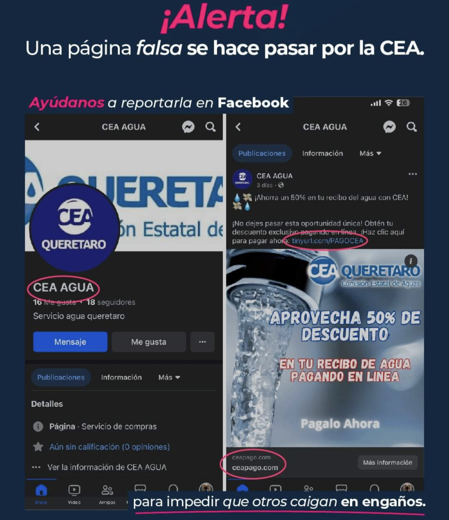 La Comisión Estatal de Aguas (CEA) comunica que detectó la existencia de una página de Facebook apócrifa, que simula brindar los servicios que ofrece oficialmente este organismo operador, además de solicitar pagos en línea para la realización de trámites, específicamente un descuento en el pago del servicio.