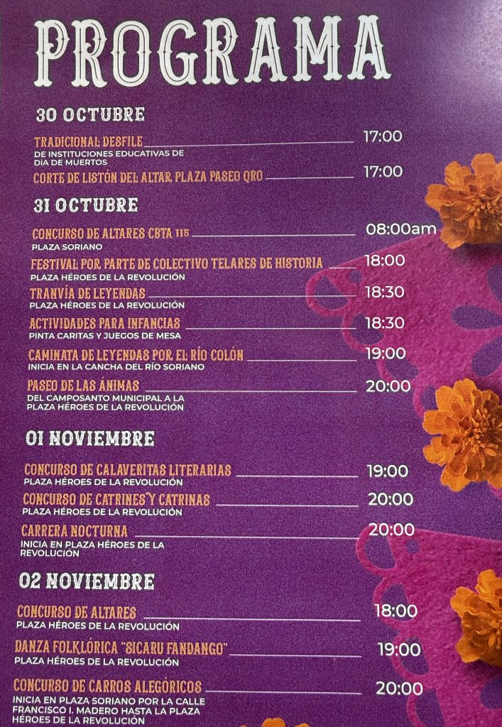 Las actividades iniciarán el 30 de octubre con el tradicional desfile de instituciones educativas y el corte de listón del altar en la Plaza Paseo Qro. Entre los eventos más esperados destacan la Caminata de Leyendas por el Río Colón, la Carrera Nocturna y el Concurso de Altares del 2 de noviembre.