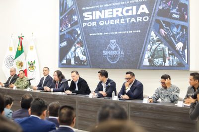 En representación del presidente municipal de Corregidora, Chepe Guerrero, la titular de la Secretaría de Gobierno, Cristina Fernández de Cevallos y el secretario de Seguridad Pública, Ángel Rangel Nieves, acudieron a la reunión para el seguimiento de objetivos de la estrategia «Sinergia por Querétaro», en las instalaciones de la Fiscalía General del Estado.