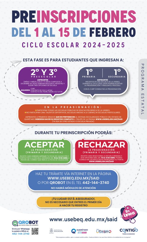 En caso de cualquier duda en el proceso, la atención a madres, padres de familia o tutores, se brindará a través de Qrobot enviando la palabra Hola al 442 144 3740, del 1 al 15 de febrero (excepto el lunes 5) en horario de 9:00 a 14:00 horas.