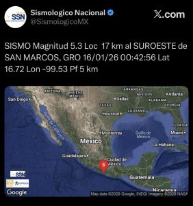 Durante la madrugada de este viernes se registró un sismo de magnitud preliminar 5.2, con epicentro a 19 kilómetros al suroeste de San Marcos, Guerrero, de acuerdo con información del Servicio Sismológico Nacional. El movimiento telúrico ocurrió a las 00:42 horas.