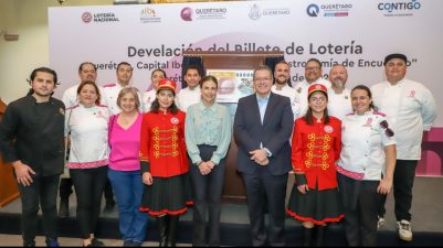 La titular de la Secretaría de Turismo del estado, Adriana Vega Vázquez Mellado, en compañía del director general de la Lotería Nacional para la Asistencia Pública, Marco Antonio Mena Rodríguez, develó el billete conmemorativo de «Querétaro, Capital Iberoamericana de la Gastronomía de Encuentro».