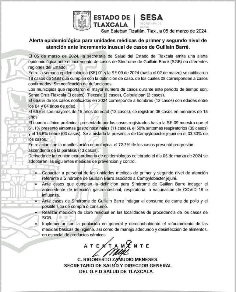 El Sector Salud de Tlaxcala (Sesa Tlaxcala) exhortó al personal de las unidades médicas de primer y segundo nivel de atención, a reforzar las medidas de capacitación al personal médico para identificar y atender padecimientos de Síndrome de Guillain Barré.