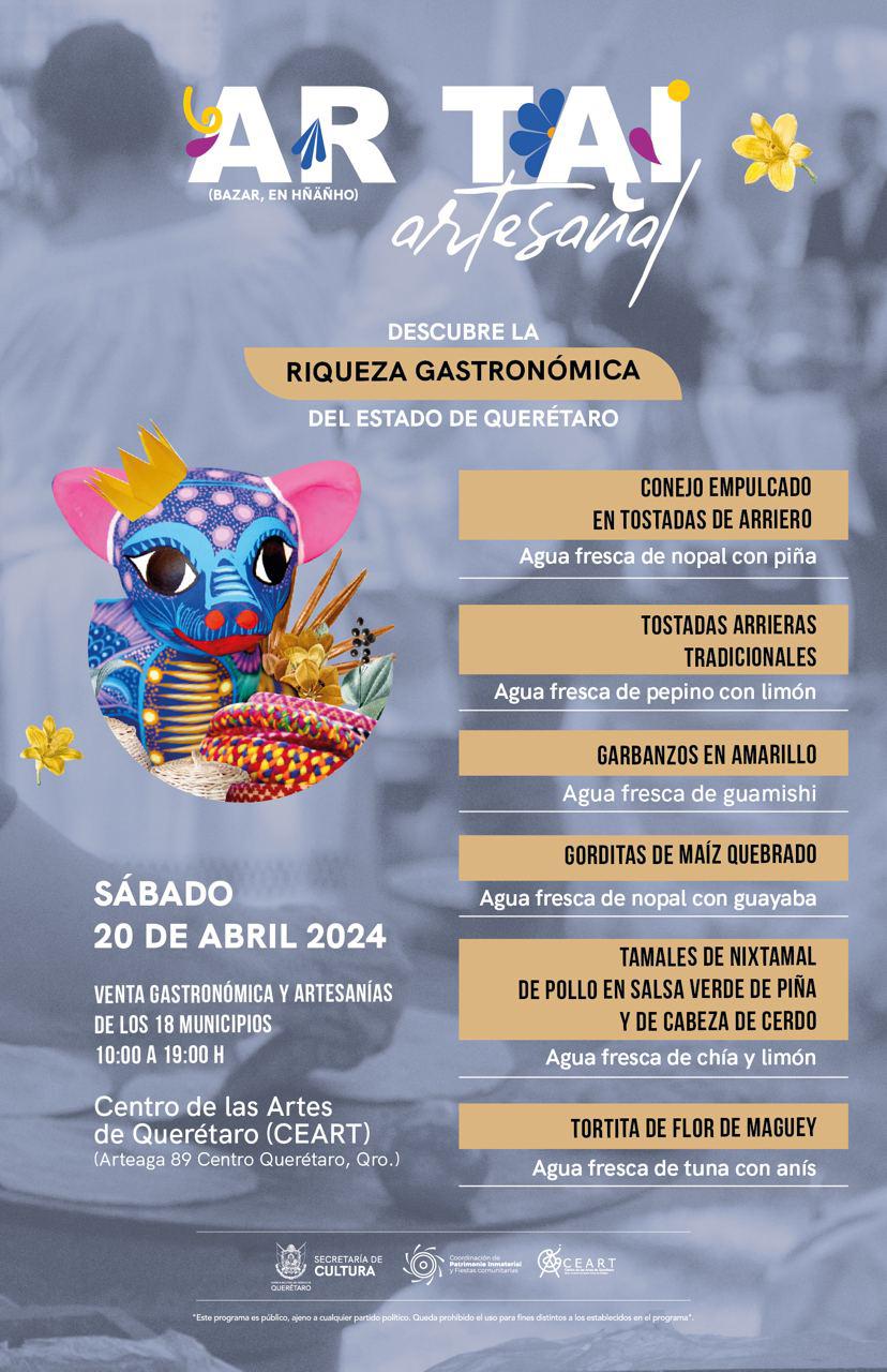 Este sábado 20 de abril, en el Centro de las Artes de Querétaro (CEART), se llevará a cabo el segundo Bazar Artesanal Ar Tai de 2024, con la participación de artesanas y artesanos de los 18 municipios del estado, en esta doceava edición dedicado a Corregidora.