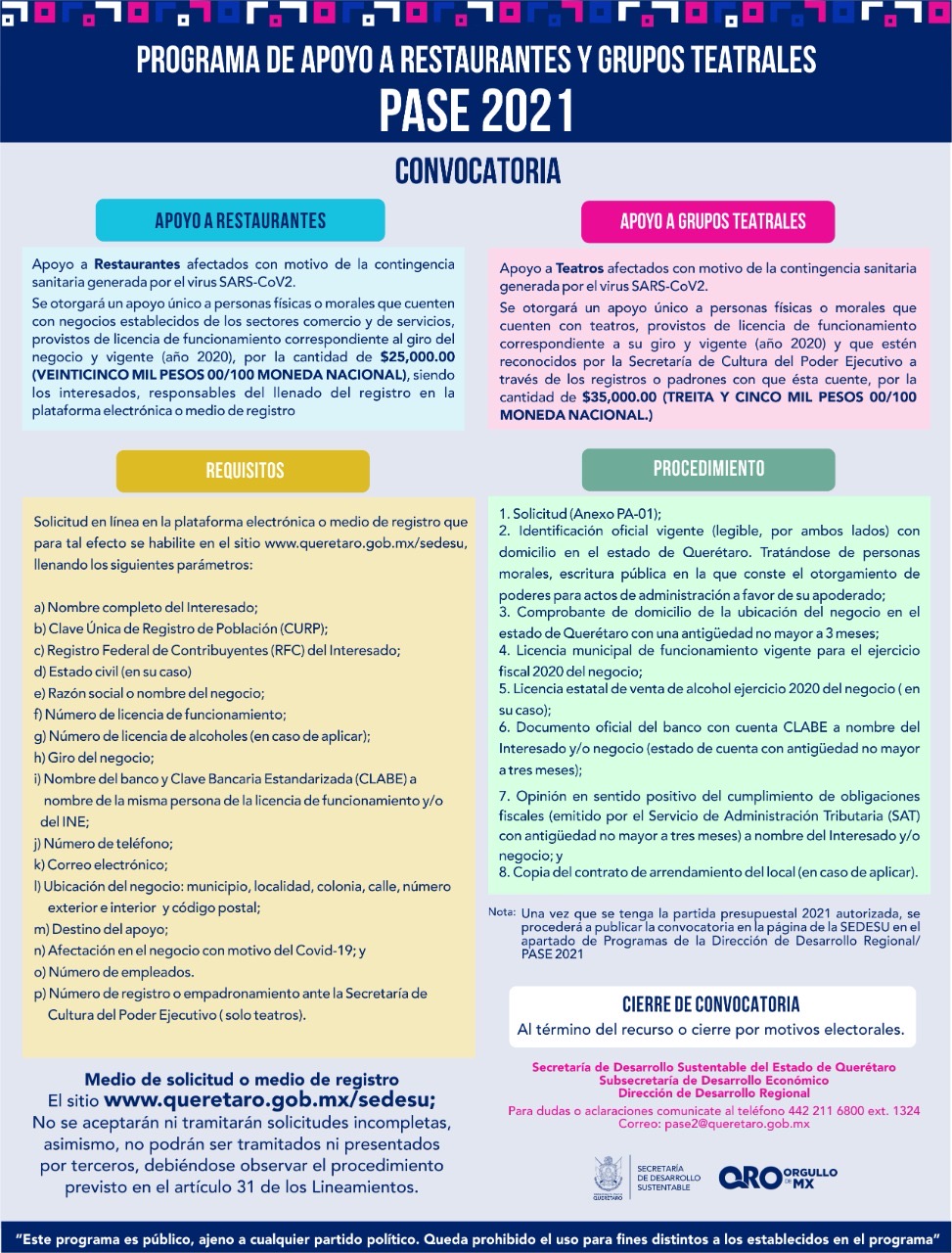 En el marco de los apoyos anunciados por el gobernador Francisco Domínguez Servién para abonar a la recuperación económica del estado, la Secretaría de Desarrollo Sustentable (SEDESU) informa que a través del Programa de Apoyo a Sectores Económicos (PASE) se destinó una bolsa total de 10 millones de pesos para apoyar a restaurantes y espacios teatrales independientes afectados por la contingencia sanitaria.