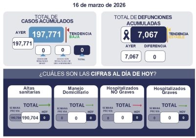 No se registraron altas sanitarias de pacientes, con lo que se tiene un registro de 190 mil 704 altas (96.42 por ciento). Con sintomatología leve, aislamiento y manejo en su domicilio no hay pacientes y ninguno se encuentra hospitalizado. Se han registrado siete mil 67 defunciones.
