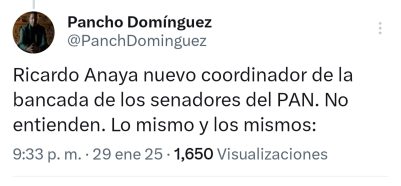 Domínguez Servién criticó la decisión y cuestionó el liderazgo dentro del partido, señalando que persisten las mismas prácticas y personajes en el PAN. «Ricardo Anaya nuevo coordinador de la bancada de los senadores del PAN. No entienden. Lo mismo y los mismos», publicó en su mensaje.