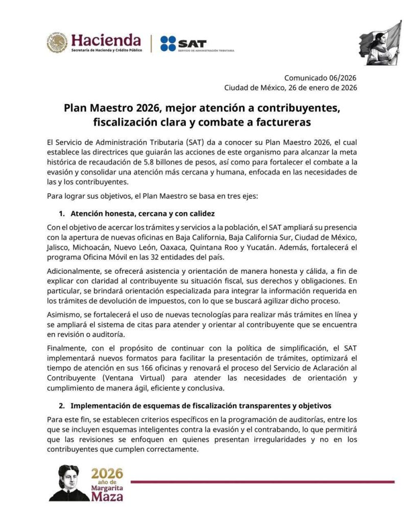 La Secretaría de Hacienda y Crédito Público, a través del Servicio de Administración Tributaria (SAT), presentó el Plan Maestro 2026, con el objetivo de alcanzar una meta histórica de recaudación de 5.8 billones de pesos, fortalecer el combate a la evasión fiscal y consolidar una atención más cercana a las y los contribuyentes.