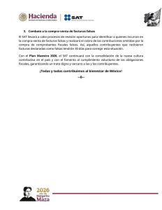 El tercer eje establece el combate a la compra-venta de facturas falsas, mediante procesos de revisión oportunos y el cobro de contribuciones omitidas. Asimismo, se otorgarán plazos para la corrección de irregularidades, con el fin de fomentar el cumplimiento voluntario y consolidar una nueva cultura contributiva.