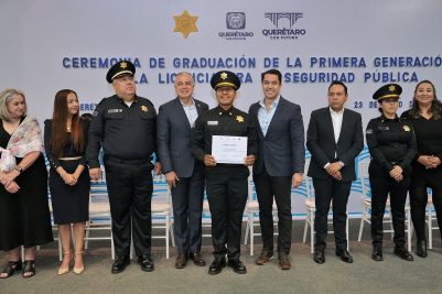 El presidente municipal de Querétaro, Felifer Macías, encabezó la Ceremonia de Graduación de 19 policías de la Primera Generación de la Licenciatura en Seguridad Pública y destacó que Querétaro es una de las ciudades más seguras del país gracias a la labor de su policía municipal y de su Secretaría de Seguridad Pública, que es una corporación de élite.