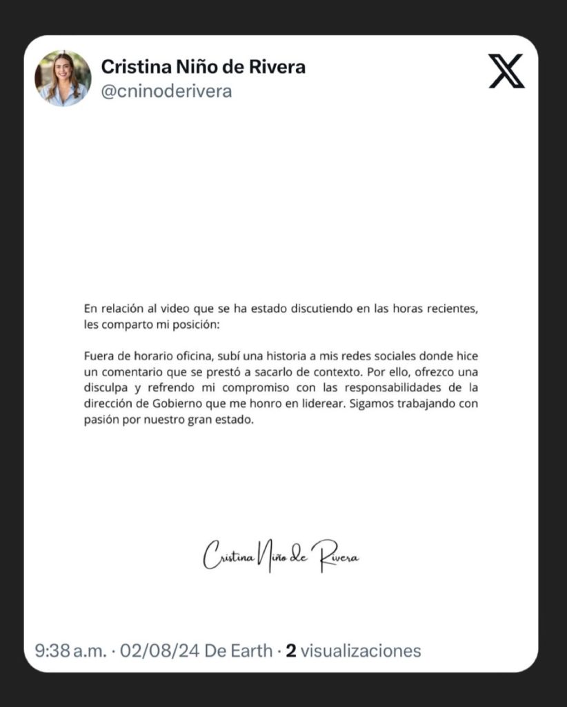 Horas más tarde, Cristina Niño de Rivera; compartió un comunicado, donde aseguró que el video se subió fuera de horario de oficina y que había sido sacado de contexto.