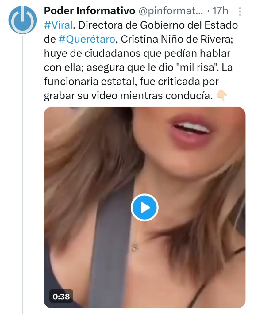 La Secretaría de Gobierno del Poder Ejecutivo del Estado de Querétaro informa a la ciudadanía que, tras la difusión de material a través de redes sociales que involucra a la Directora de Gobierno, María Cristina Niño de Rivera Burgueño, se ha tomado la decisión de concluir con la relación laboral que mantenía con esta dependencia.