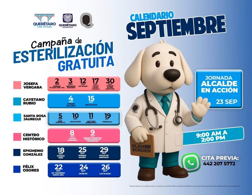 Asimismo, se informa a la ciudadanía que en las redes sociales oficiales del Municipio de Querétaro, de la Secretaría de Bienestar Animal, así como de la titular, Lennyz Meléndez Chacón, se encuentra publicado el calendario de jornadas de esterilización gratuitas para el mes de septiembre y podrán consultar las ubicaciones. Las personas interesadas podrán agendar su cita a través de WhatsApp al 442 207 5772.